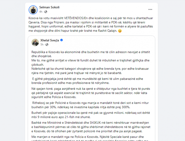 “Kosova ka votu masivisht Vetëvendosje dhe koalicionin e saj për të mos u shantazhuar Qeveria. Disa nga Prizreni, pa maska i njohim si militantët e PDK-së, kështu që lëreni hajgaret, hiqni uniformat, edhe kartelat e PDK-së që i keni në formën e atyre të pasluftës me shqiponjë dhe dilni hapur krahë për krahë me Rashit Qalajn”, ka shkruar Sokoli.