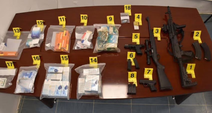 Gjatë kontrollit të kryer në pronat e të dyshuarit, me asistencën e inspektorëve nga Ministria e Shëndetësisë, u gjetën dhe u sekuestruan dy armë zjarri të gjata dhe dy armë zjarri të shkurtra, si dhe sasi të ndryshme municioni dhe karikatorë të armëve.